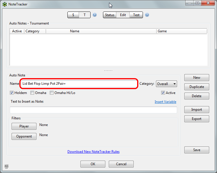 NoteTracker - встроенное приложение PokerTracker 4, которое позволяет создавать и редактировать определения «нотсов», а затем автоматически записывать и выводить их в HUDе.